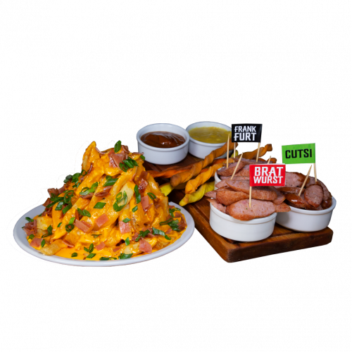 Salchichas Frankfurt, Salchichas Bratwurst, Salchichas Cutsi, Grisines, Papas cheddar, dip de currywurst, dip de salsa mostaza