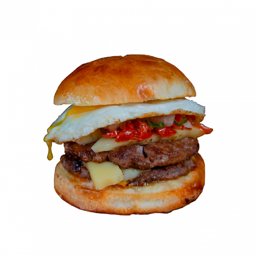 Pan de Papa, Doble medallón de carne de 100gr, Doble Provoleta, Morrones asados, Salsa Criolla, Huevo frito, Mayochurri, acompañado de papas fritas!