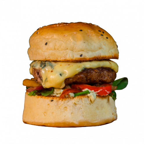 Pan Brioche, Medallón de carne, Salsa BlueCheese, Queso Bluecheese, Verduras asadas, rúcula, acompañado de papas fritas!
