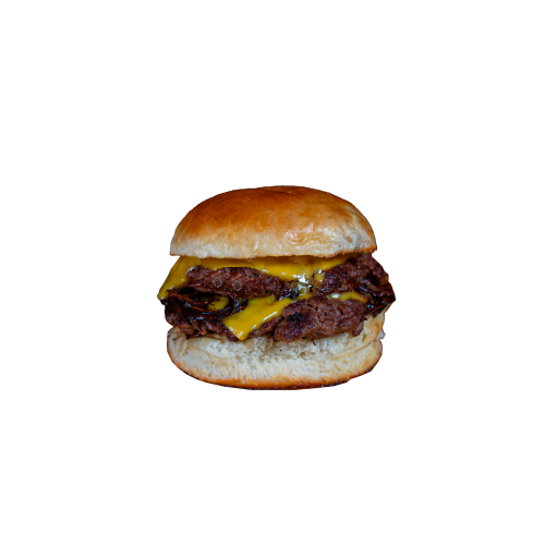 Pan de Papa, Doble medallón de carne smash de 100 gr. Doble Cheddar, cebolla a la plancha, pepinillos, acompañado de papas fritas!