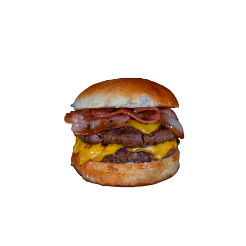 Pan de Papa, Doble medallón de carne de 100gr. Doble Cheddar, Bacon, acompañado de papas fritas!