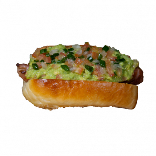 Pan brioche, Salchicha Cutsi, Guacamole, Criolla, Barbacoa, acompañado de papas fritas!