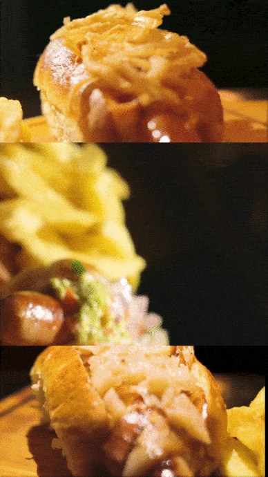 Pan brioche, Salchicha Bratwurst, Bacon crispy, Cebolla crispy, Cheddar, Miel mostaza, Barbacoa, aco..